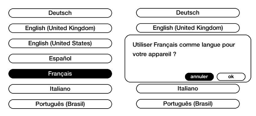 Définir votre langueUtilisez le bouton de navigation pour sélectionner votre langue de préférence à partir de la liste puis choisissez OK à partir de la fenêtre contextuelle pour confirmer. Note : L'écran du Kindle deviendra blanc lorsqu'il chargera la langue de préférence.