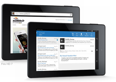 | Écran | Écran tactile haute définition 7 pouces (diagonale visible de 17 cm), résolution de 1280 x 800 (216 ppp), lecture vidéo jusqu'à 720p, technologie IPS (In-Plane Switching) et filtre polarisant avancé | | Taille | 191 mm x 128 mm x 10,6 mm | | Poids | 337 grammes Le poids et la taille exacts varient selon la configuration et le procédé de fabrication | | Processeur & RAM | Processeur quadricœur 2 @ 1,5 Ghz + 2 @ 1,2 GHz et 1 Go de RAM | | Stockage | Mémoire interne de 8 Go (environ 4,5 Go disponibles pour le contenu de l'utilisateur) ou de 16 Go (environ 11,6 Go disponibles pour le contenu de l'utilisateur) | | Autonomie de la batterie | Jusqu'à 8 heures d'autonomie pour lire, surfer sur le Web ou écouter de la musique. L'autonomie de la batterie variera en fonction du paramétrage de l'appareil, de l'utilisation et d'autres facteurs comme la navigation sur le Web ou le téléchargement de contenus. Les résultats peuvent varier | | Temps de charge | Charge complète en moins de 6 heures en utilisant le chargeur micro-USB (inclus dans la boîte), ou un peu plus en utilisant un autre chargeur micro-USB | | Connexion Wi-Fi | Wi-Fi à antenne simple. L'appareil se connecte aux réseaux Wi-Fi publics et privés ainsi qu'aux points d'accès qui utilisent les standards 802.11b, 802.11g, ou 802.11n avec sécurité WEP, WPA et WPA2 qui nécessitent un mot de passe. Il ne prend pas en charge les réseaux Wi-Fi ad hoc (ou peer-to-peer) | | Connexion 4G | Aucune | | Ports | Port SlimPort compatible USB 2.0 (connecteur micro-B) pour connecter votre appareil à une télévision HD ou un moniteur VGA avec un adaptateur, le connecter à un ordinateur PC ou Mac ou le charger avec le chargeur inclus | | Audio | Prise audio stéréo 3,5 mm, haut-parleurs stéréo intégrés avec moteur audio Dolby Digital Plus | | Formats de contenus pris en charge | Kindle (AZW), KF8, TXT, PDF, MOBI non protégé, PRC natif, DOC, DOCX, JPEG, GIF, PNG, BMP, Dolby Digital (AC-3), Dolby Digital Plus (E-AC-3), non-DRM AAC, MP3, MIDI, PCM/WAVE, OGG, WAV, M4V, MP4, AAC LC/LTP, HE-AACv1, HE-AACv2, MKV, AMR-NB, AMR-WB, HTML5, CSS3, 3GP, VP8 (WEBM) | | Détecteurs | Accéléromètre, gyroscope | | Caméra | Caméra frontale VGA. Caméra arrière HD de 2 Mpx | | Services de localisation | Services géolocalisés via le Wi-Fi | | Fonctionnalités supplémentaires | Contrôles de volume externes, Bluetooth intégré compatible avec les casques stéréo, haut-parleurs et microphones A2DP | | Fonctions d'accessibilité | Lecteur d'écran, Explorer au toucher et Loupe, permettant d'accéder à la majorité des fonctionnalités de la tablette Fire. Le lecteur d'écran utilise les voix naturelles du moteur de synthèse vocale IVONA. Comprend également des tailles/couleurs de police ajustables et un dictionnaire intégré. | | Garantie et services | Fire HD 7 est vendu avec une garantie internationale limitée d'un an fournie par le fabricant que vous pouvez retrouver ici. Si vous êtes un consommateur, la Garantie Limitée ne remet pas en question vos droits en tant que consommateur et est fournie en complément des garanties légales, notamment, si vous êtes un consommateur résidant en France, la garantie légale de conformité et la garantie contre les vices cachés. Pour en savoir plus sur ces garanties légales, cliquez ici. L'utilisation du Kindle Fire HD 7 est soumise aux termes que vous trouverez ici. | | Contenu de la boîte | La tablette Fire HD 7, un câble d'alimentation USB 2.0, un chargeur de 9 W et le guide de démarrage. |