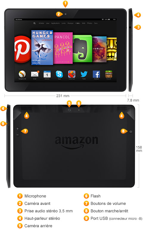 Le poids et la taille exacts varient selon la configuration et le procédé de fabrication | | Processeur & RAM | Processeur Snapdragon 8084 quadricœur cadencé à 2,5 GHz, puce graphique Adreno 420 GPU et 2 Go de RAM | | Stockage | Mémoire interne de 16 Go (environ 9,9 Go disponibles pour le contenu de l'utilisateur), de 32 Go (environ 24,3 Go disponibles pour le contenu de l'utilisateur) ou de 64 Go (environ 52,9 Go disponibles pour le contenu de l'utilisateur) | | Autonomie de la batterie | Jusqu'à 11 heures d'autonomie pour lire, surfer sur le Web ou écouter de la musique. Jusqu'à 18 heures d'autonomie quand utilisé pour la lecture seulement. L'autonomie de la batterie variera en fonction du paramétrage de l'appareil, de l'utilisation et d'autres facteurs comme la navigation sur le Web ou le téléchargement de contenus. Les résultats peuvent varier | | Temps de charge | Charge complète en moins de 5 heures en utilisant l'accessoire de recharge PowerFast, ou un peu plus en utilisant un autre chargeur micro-USB | | Connexion Wi-Fi | Wi-Fi bi-bande à double antenne (MIMO+HT80) pour un débit plus rapide et moins de pertes de connexion. L'appareil se connecte aux réseaux Wi-Fi publics et privés ainsi qu'aux points d'accès qui utilisent les standards 802.11a, 802.11b, 802.11g, 802.11n ou 802.11ac avec sécurité WEP, WPA et WPA2 qui nécessitent un mot de passe. Il ne prend pas en charge les réseaux Wi-Fi ad hoc (ou peer-to-peer) | | Connexion 4G | Prise en charge des réseaux sans fil 4G LTE ultra-rapides avec HSPA+ et HSDPA (version 4G uniquement) | | Ports | Port SlimPort compatible USB 2.0 (connecteur micro-B) pour connecter votre appareil à une télévision HD ou un moniteur VGA avec un adaptateur, le connecter à un ordinateur PC ou Mac ou le charger avec le chargeur PowerFast inclus | | Audio | Prise audio stéréo 3,5 mm, haut-parleur stéréo intégré avec moteur Dolby Audio | | Formats de contenus pris en charge | Kindle (AZW), KF8, TXT, PDF, MOBI non protégé, PRC natif, DOC, DOCX, JPEG, GIF, PNG, BMP, Dolby Digital (AC-3), Dolby Digital Plus (E-AC-3), non-DRM AAC, MP3, MIDI, PCM/WAVE, OGG, WAV, M4V, MP4, AAC LC/LTP, HE-AACv1, HE-AACv2, MKV, AMR-NB, AMR-WB, HTML5, CSS3, 3GP, VP8 (WEBM) | | Détecteurs | Détecteur de lumière ambiante, accéléromètre, gyroscope, GPS (4G) | | Caméra | Caméra frontale HD 720p. Caméra arrière de 8 Mpx avec flash LED, stabilisateur électronique d'image et un objectif à grande ouverture 5P f/2,2 | | Services de localisation | Services géolocalisés via le Wi-Fi. Modèle 4G via le Wi-Fi et le GPS | | Fonctionnalités supplémentaires | Contrôles de volume externes, microphone double intégré, Bluetooth intégré compatible avec de nombreux accessoires sans fil comme des claviers et des manettes de jeu, et compatible avec les casques stéréo et haut-parleurs A2DP | | Fonctions d'accessibilité | Lecteur d'écran, Explorer au toucher et Loupe, permettant d'accéder à la majorité des fonctionnalités de la tablette Fire. Le lecteur d'écran utilise les voix naturelles du moteur de synthèse vocale IVONA. Comprend également des tailles/couleurs de police ajustables et un dictionnaire intégré. | | Garantie et services | Fire HDX 8.9 est vendu avec une garantie internationale limitée d'un an fournie par le fabricant que vous pouvez retrouver ici. Si vous êtes un consommateur, la Garantie Limitée ne remet pas en question vos droits en tant que consommateur et est fournie en complément des garanties légales, notamment, si vous êtes un consommateur résidant en France, la garantie légale de conformité et la garantie contre les vices cachés. Pour en savoir plus sur ces garanties légales, cliquez ici. L'utilisation du Kindle Fire HDX 8.9 est soumise aux termes que vous trouverez ici. | | Contenu de la boîte | La tablette Fire HDX 8.9, un câble d'alimentation USB 2.0, un chargeur de 9 W et le guide de démarrage. |